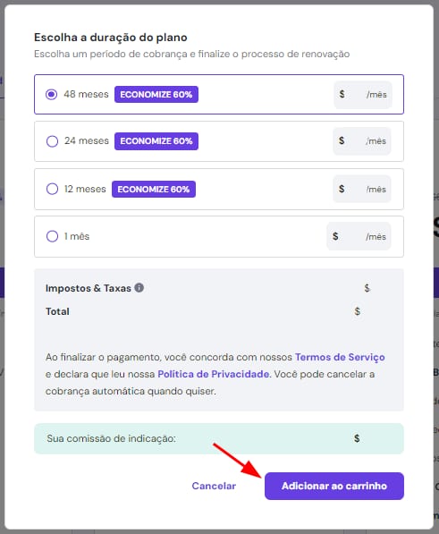 Selecione a duração do plano e clique em Adicionar ao carrinho:
