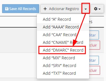 Em seguida, abra a lista suspensa no botão adicionar registro e selecione adicionar registro DMARC:
