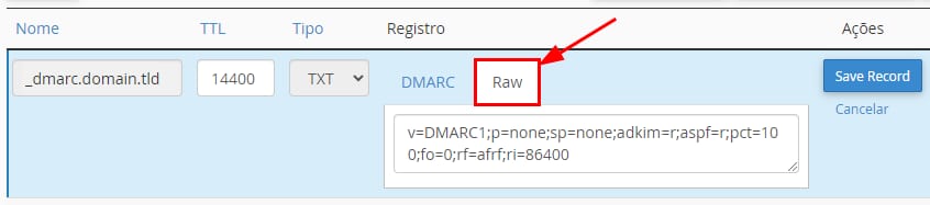 O nome do registro, TTL e tipo serão adicionados automaticamente. Selecione Raw: