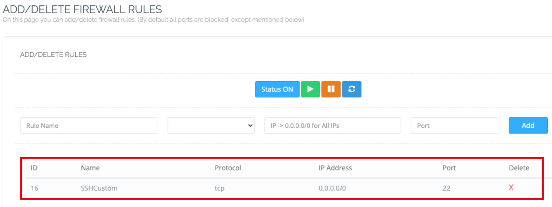 Após habilitar o acesso root, você deve confirmar se a porta SSH 22 é permitida pelo firewall CyberPanel. No painel Configurações de segurança , navegue até a seção Firewall e verifique se a regra para permitir a porta 22 está presente lá:
