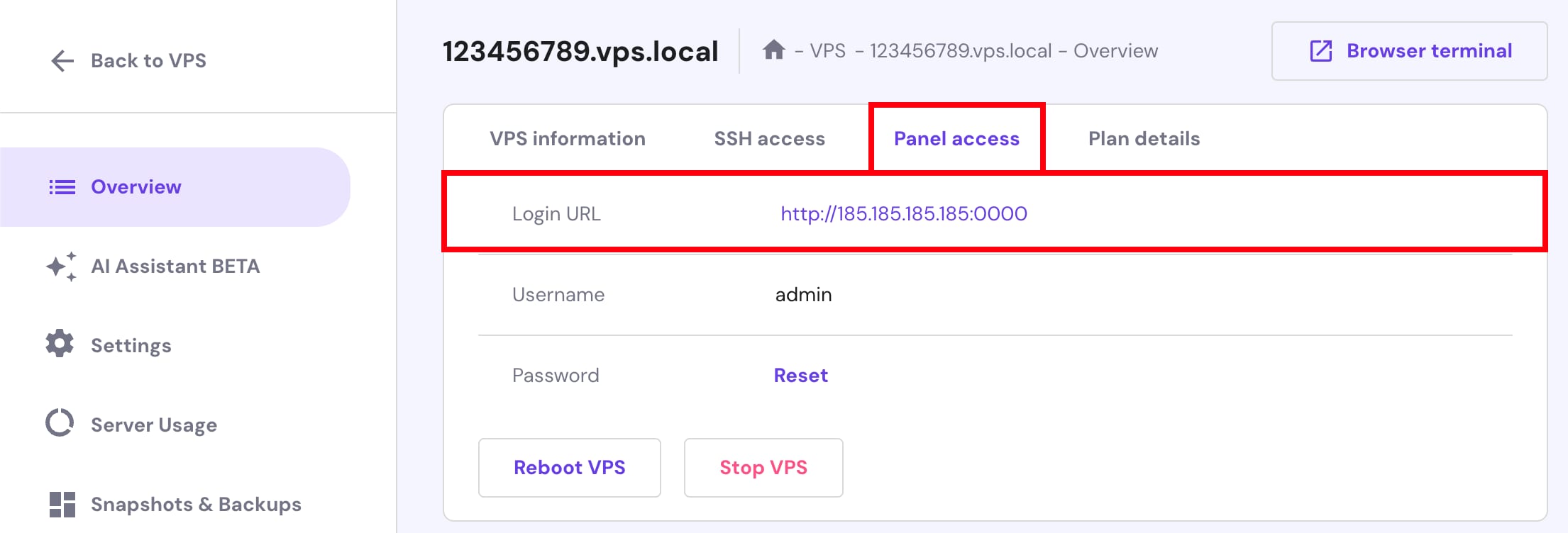 Na seção VPS, clique no servidor em questão. Abra a aba de acesso ao painel e clique em URL de login :