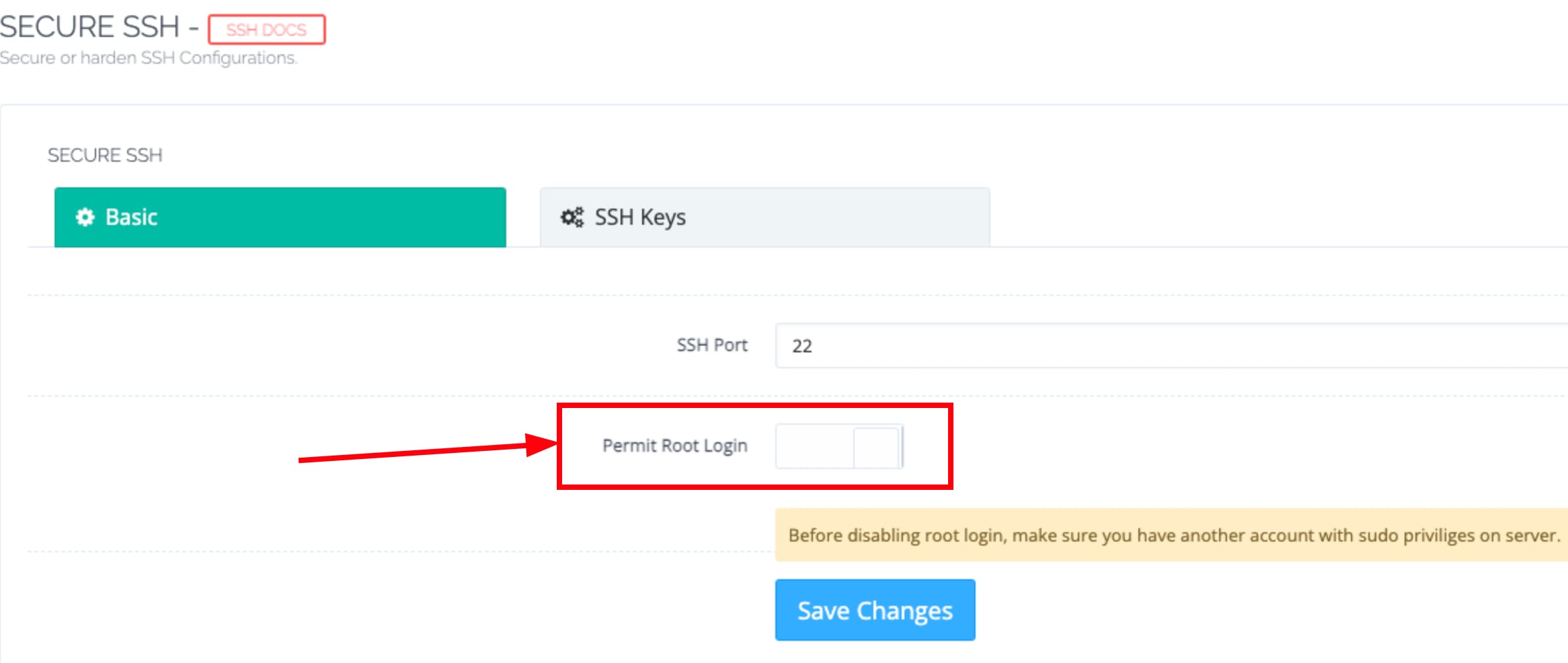 Na página de configurações, você encontrará uma opção relacionada ao acesso root. Habilite a opção Permitir login raiz e salve as alterações: