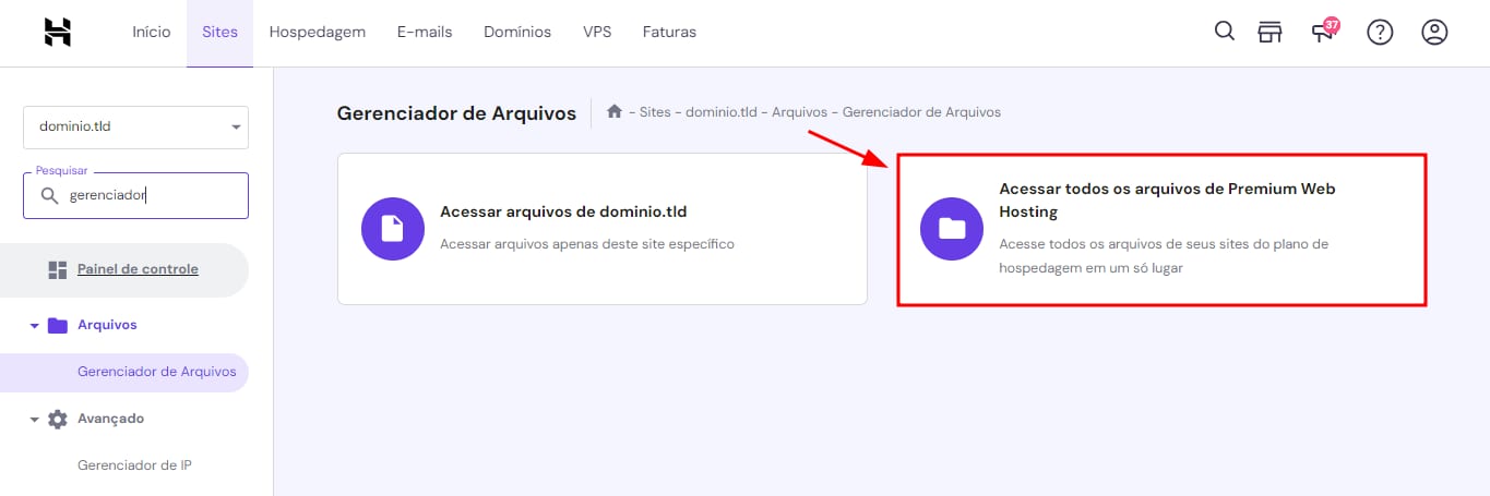 Vá para o Gerenciador de Arquivos do seu site. Selecione a opção Acessar todos os arquivos do seu plano de hospedagem: