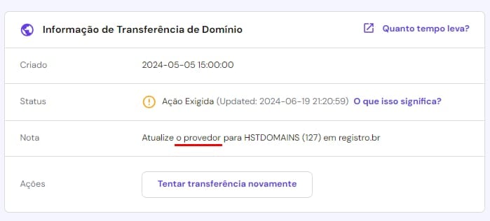 Caso você ainda não esteja usando o nosso provedor de serviços (HSTDOMAINS 127), a transferência não será concluída e verá um aviso. Para corrigir, siga os passos do vídeo acima.