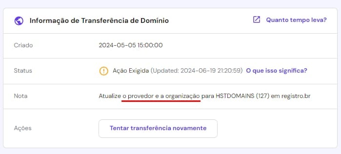 “Atualize o provedor e a organização para HSTDOMAINS(127) a Registro.br” verifique se tanto a titularidade de domínio quanto a organização estão configurados corretamente no Registro.br.