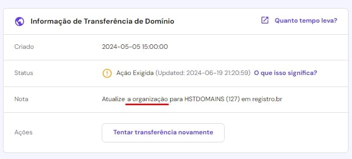 “Atualize a organização para HSTDOMAINS(127) a Registro.br” verifique se a organização do domínio está configurada corretamente no Registro.br.