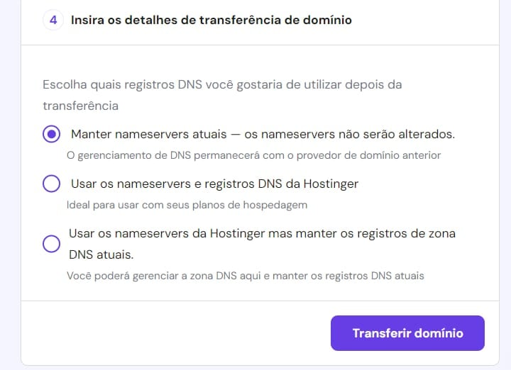 No próximo passo você poderá escolher entre usar o DNS da Hostinger ou manter o DNS atual. E então, basta escolher a opção que deseja e clicar em “transferir”