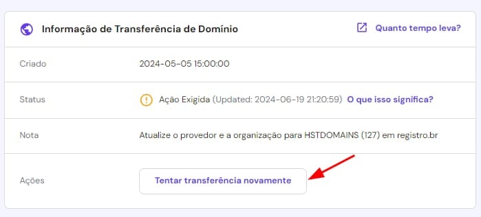 Após alterar o provedor, basta clicar em “Tentar transferência novamente”.