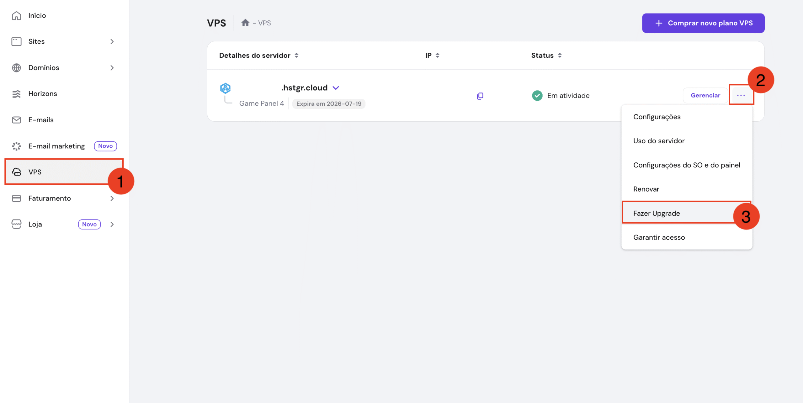 Para alterar o plano, acesse a seção “VPS”, clique no botão de três pontos (⋯) ao lado do servidor em questão e, em seguida, clique em “Upgrade“.