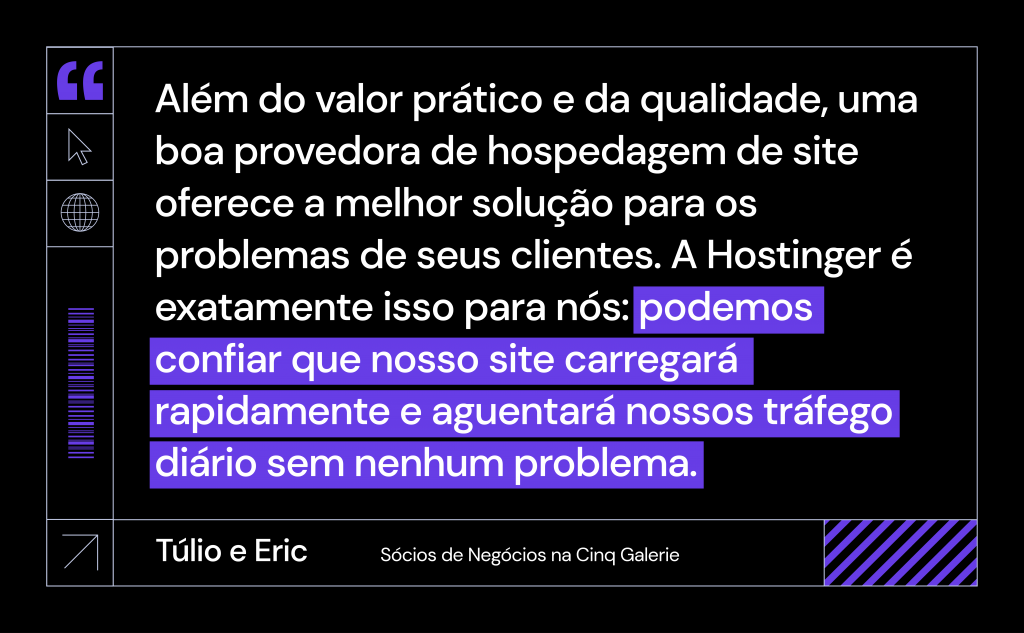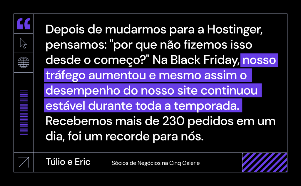 Quando se trata de e-Commerce, o tempo de atividade do seu site conta muito para o sucesso do seu negócio. Após inúmeros acidentes que deixaram o site de Túlio e Eric indisponível, eles decidiram procurar uma provedora de hospedagem que pudesse manter sua loja online ativa 24 horas por dia, não importa a quantidade de tráfego. Descubra como migrar para a Hostinger melhorou o desempenho, a confiabilidade e a experiência do cliente no site da Cinq Galerie.