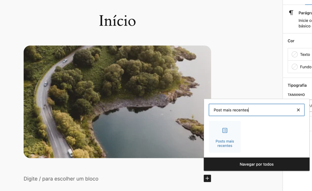 Para temas em blocos, use o editor de site Gutenberg para personalizar sua página inicial e criar uma seção dedicada para posts.