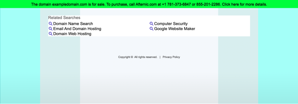 Alguns nomes de domínio são comprados para serem revendidos posteriormente por um preço mais alto. Nesses casos, o site informará a disponibilidade do domínio para venda e fornecerá informações de contato imediatamente, como no exemplo abaixo.