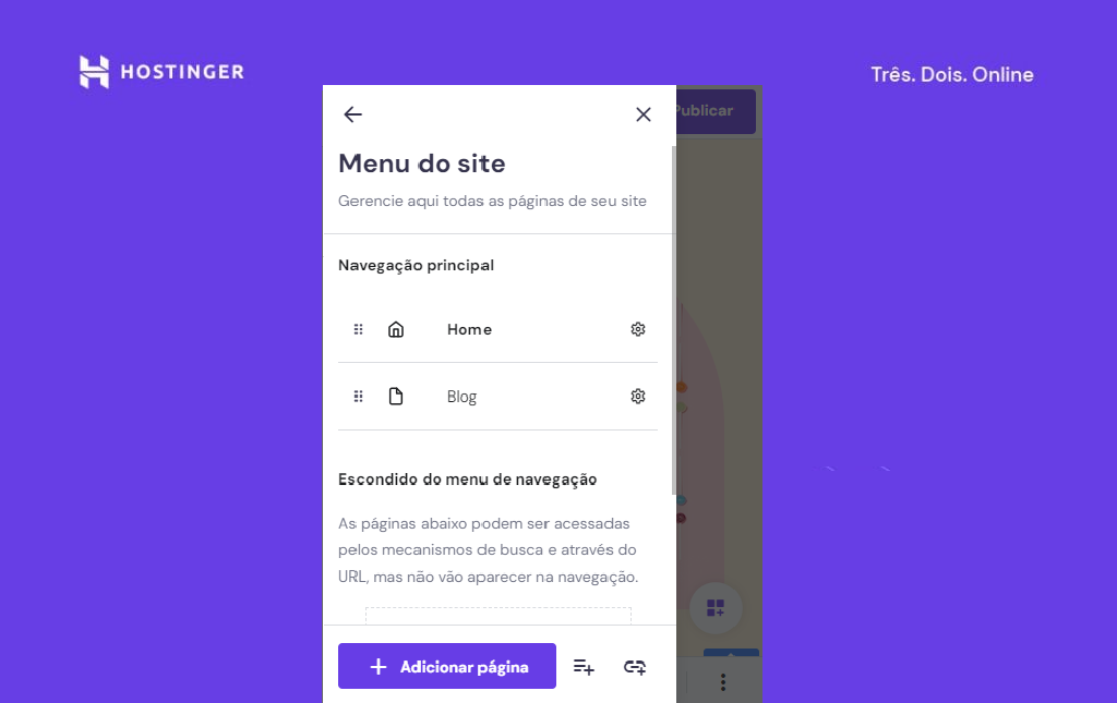 • Em Menu do site, gerencie quais páginas aparecem na navegação.