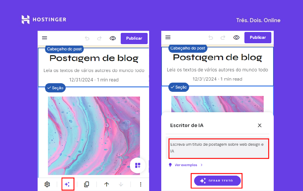 • Use o Assistente com IA para gerar conteúdo otimizado para SEO em alguns segundos. Adicione uma caixa de texto ou selecione uma já existente. Feito isso, toque no ícone Assistente com IA, descreva o que você quer e gere o texto.