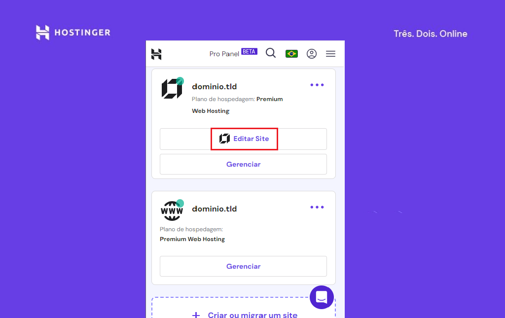 2. Para editar um site criado com o Criador de Sites da Hostinger, selecione Editar Site abaixo do nome dele.