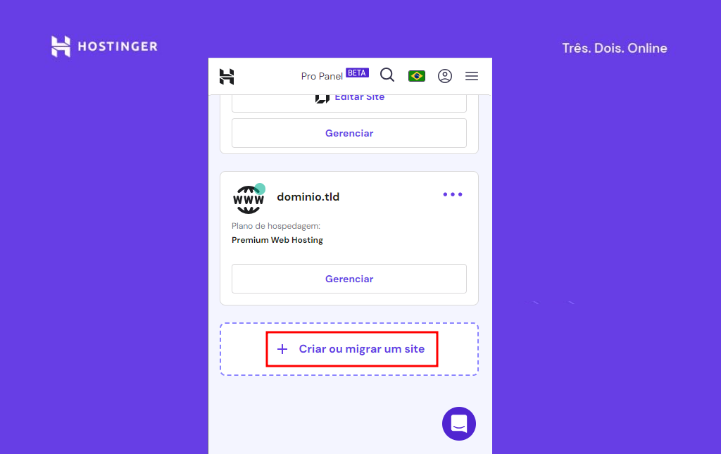 3. Se quiser criar um novo site, toque em Criar ou migrar um site.