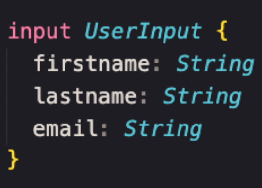 Input (entrada). o tipo UserInput é um tipo de Usuário (User type) sem id e campos de projetos. Note que a palavra-chave é input e não type. Imagine que ele seja um formulário em uma página em que você precisa preencher alguns dados e quais os tipos de informações necessários para criar um perfil de usuário.
