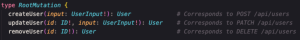 Mutations (mudanças de conteúdo). Se as consultas (queries) são solicitações (requests) GET, as mudanças de conteúdo podem ser vistas como solicitações POST | PATCH | PUT | DELETE que modificam os dados. O exemplo traz mudanças de conteúdo de “createUser” (criar usuário), “updateUser” (atualizar usuário), “removeUser” (remover usuário).