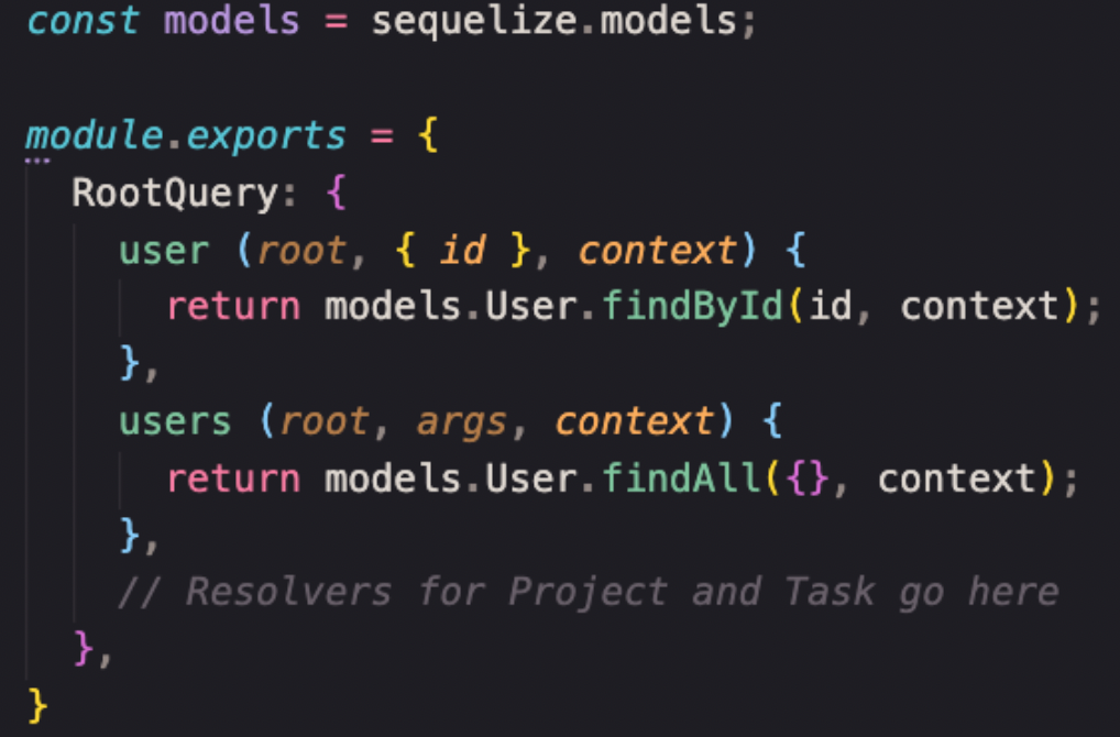 Queries (consultas). As queries definem quais consultas você pode executar seu GraphQL API. Por convenção, deve haver um RootQuery, que contém todas as consultas existentes. No exemplo, o comentário mostra como fica o restante da API. Nos parênteses entre os colchetes, vemos um argumento que precisa ser o único identificador, o que vem após s dois pontos é o tipo de usuário. Ele mostra o que deve ser retornado quando fazemos essa consulta, e depois retorna ao usuário. Logo, se consultamos um projeto, o projeto será retornado, se consultarmos uma tarefa (task), a tarefa será retornada, e assim por diante.