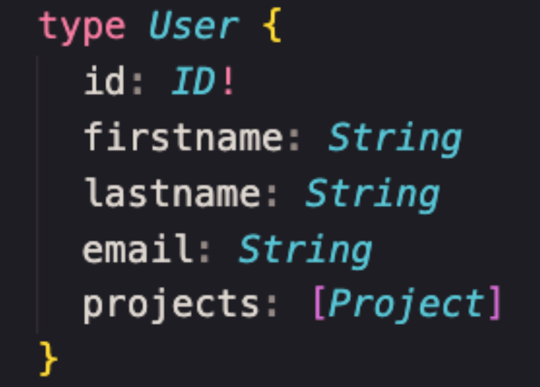 Types (tipos). O modelo de dados no GraphQL é representado em tipos, que são fortemente tipados (typed). Deve haver um mapeamento one-to-one entre eus modelos e os codigos do GraphQL. Pense nisso como uma tabela de banco de dados em que a tabela do usuário tenha campos como id, primeiro nome, sobrenome, e-mail, projetos. Coisas que valem a pena lembrar: o ponto de exclamação que indica que um identificador (id) não pode ser anulável ou, em outras palavras, é preciso ter algo no identificador por ser um campo obrigatório.