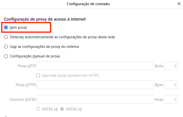 Também é possível que a conexão proxy esteja ativa nas configurações de conexão do seu Firefox, causando o PR_END_OF_FILE_ERROR. Siga estes passos para desligar: