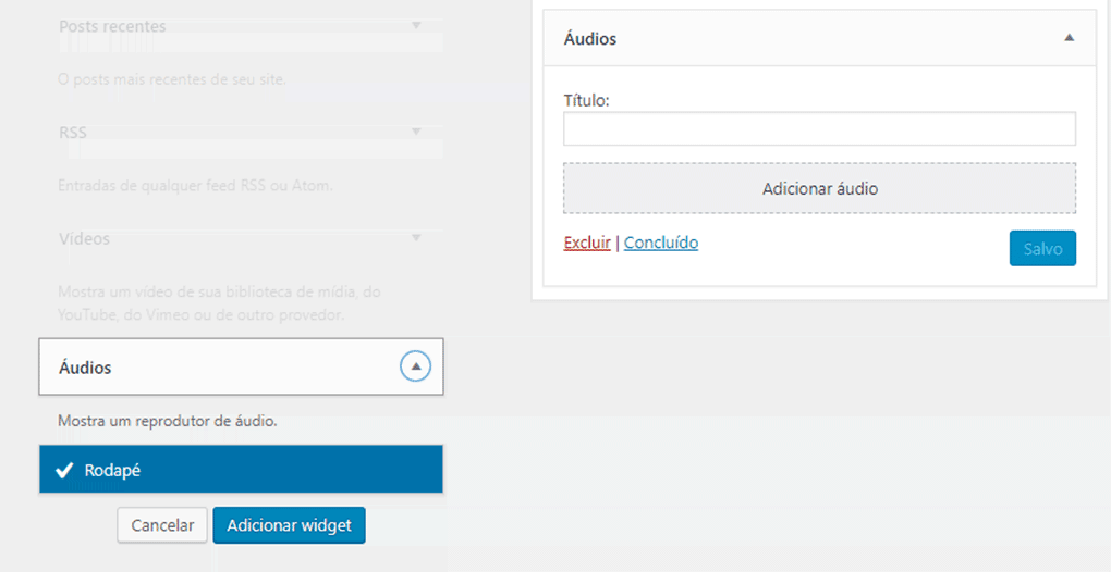 O WordPress possui um tocador de áudio integrado que permite que você exiba e reproduza arquivos de áudio em seu site. Ele pode ser incluído em postagens ou transformado num widget para ser posicionado em qualquer lugar de seu website.