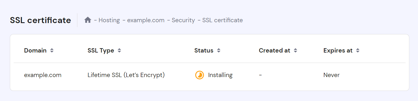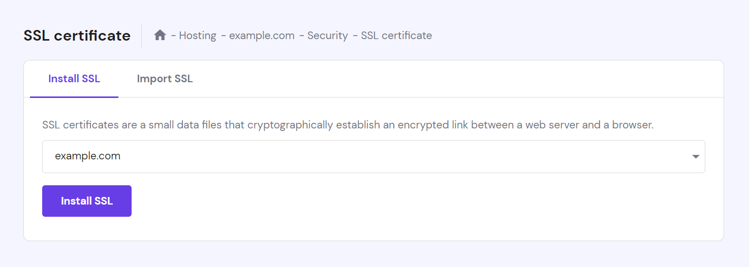 Most hosting companies like Hostinger offer a built-in feature to install an SSL certificate. That way, users can easily set up a certificate instead of searching for one on their own.
