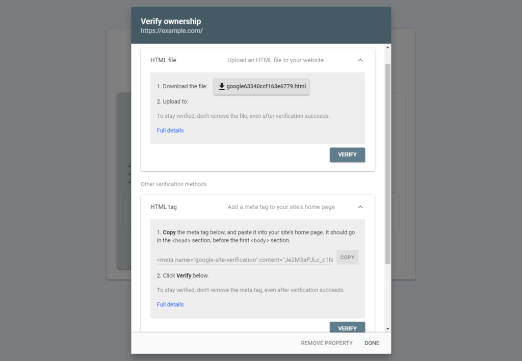 La siguiente página te dará dos opciones para verificar tu dominio: subir un archivo HTML a tu sitio web o añadir una metaetiqueta.