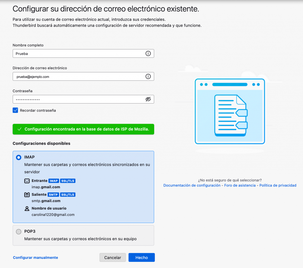 Si el sistema no puede encontrar la configuración de tu cuenta, edita los nombres de tus servidores e introduce manualmente los puertos IMAP/POP3. Haz clic en Volver a comprobar hasta que Mozilla Thunderbird pueda configurar tu dirección.