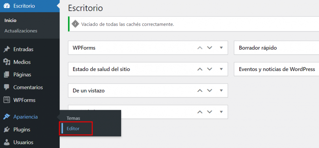 Para acceder al editor, pasa el ratón por Apariencia y selecciona Editor.