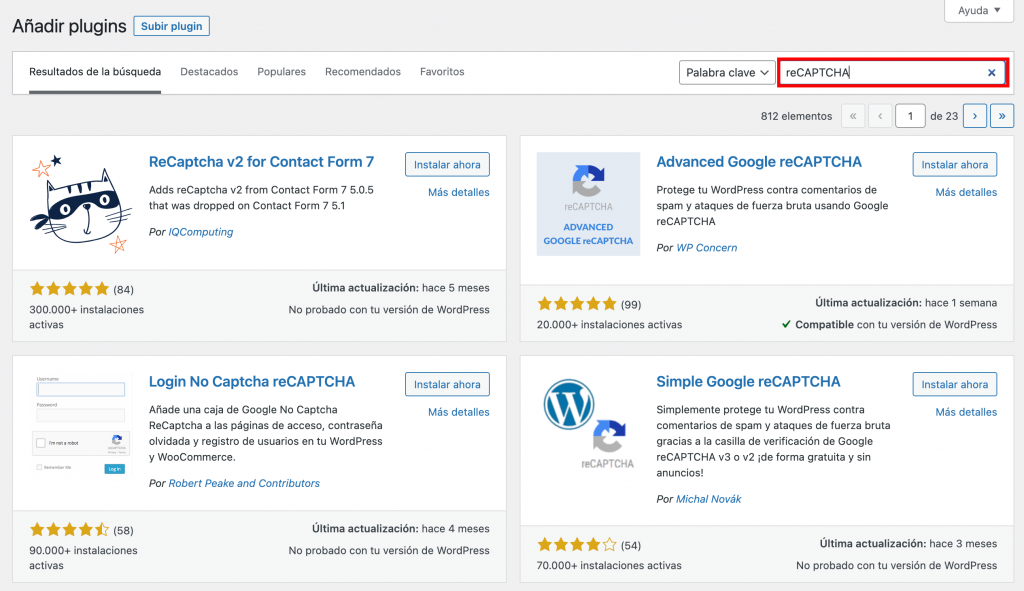 Para buscar todos los plugins reCAPTCHA disponibles, dirígete a Escritorio -> Plugins -> Añadir nuevo. Introduce en la casilla de búsqueda la palabra reCAPTCHA y verás que la mayoría de los resultados de la búsqueda aparecerán como plugins de formulario de contacto.