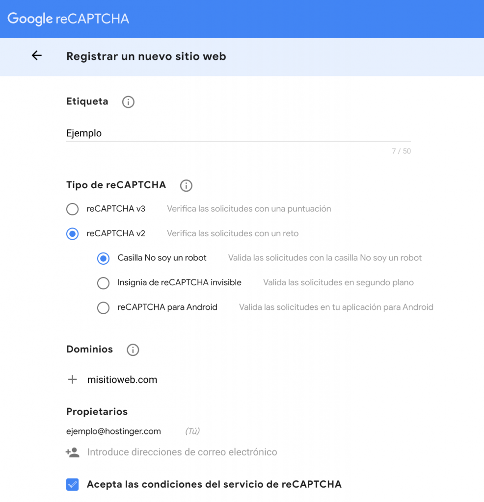 Allí, rellena el formulario según las necesidades de tu sitio web: