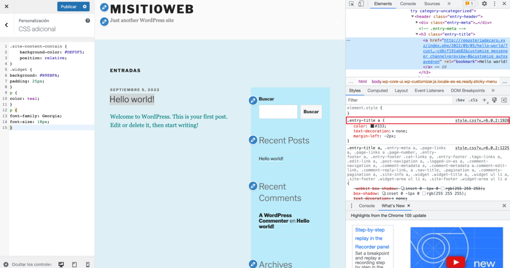 Para personalizar tu child theme o tema hijo, necesitas un conocimiento y una comprensión básica de las reglas CSS y de cómo inspeccionar los elementos para poder localizar su código CSS y la clase a la que están asignados.