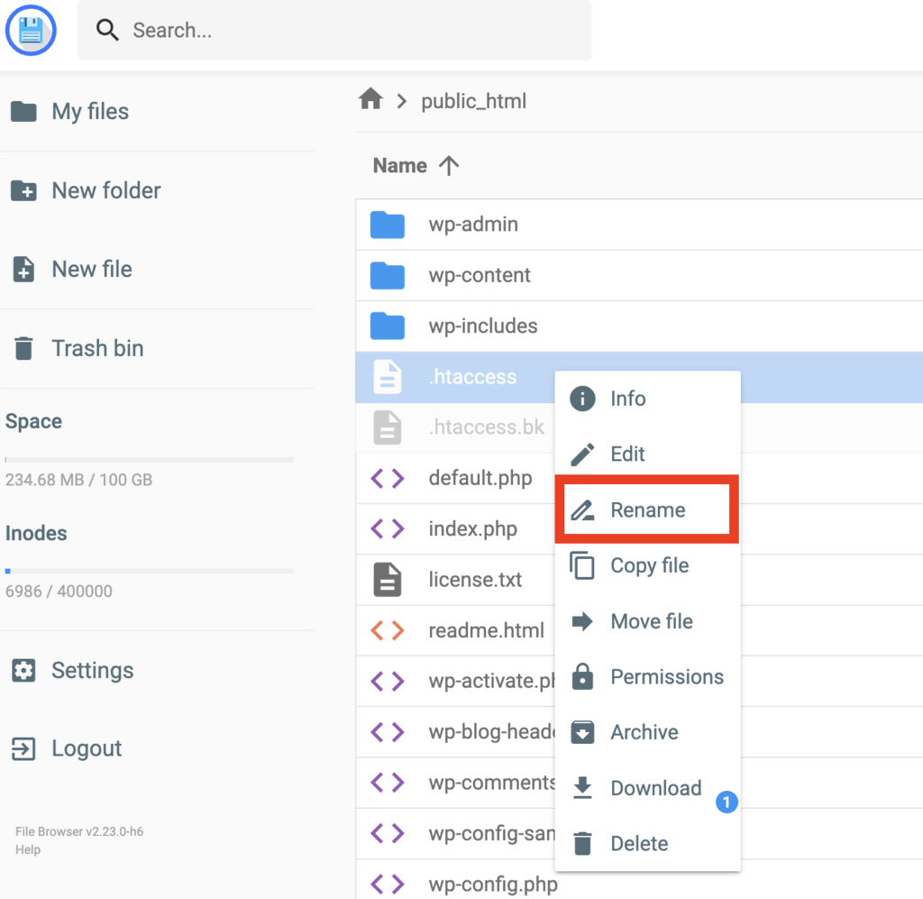 Daher müssen Sie die Dateiberechtigungen ändern, um dieses Problem zu lösen. Wenn Sie ein Hostinger-Benutzer sind, sind die Standardwerte 644 für Dateien und 755 für Ordner.