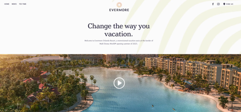 Andere Unternehmen nutzen „Coming Soon”-Landingpages, um Markenbekanntheit aufzubauen und Kaufentscheidungen zu beeinflussen. Das zweite Beispiel eines neuen Ferien-Resorts zeigt auf der „Coming Soon”-Website Einzelheiten über die bevorstehenden Einrichtungen und erläutert, wie diese seiner Zielgruppe zugutekommen.