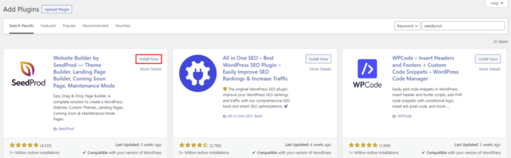 Navigieren Sie zu Plugins → Neu hinzufügen in Ihrem WordPress-Dashboard. Suchen Sie SeedProd, indem Sie den Namen in die Suchleiste eingeben, dann installieren und aktivieren Sie das Plugin.