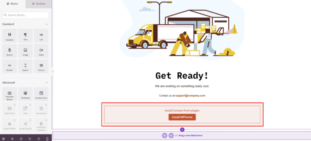 Der Drag-and-Drop-Seiteneditor ermöglicht es Ihnen, Elemente aus dem Blocks-Tab zur Seitenvorschau hinzuzufügen und zu verschieben. Fügen Sie zum Beispiel den Kontaktformular-Block per Drag-and-Drop auf die Seite hinzu, um Ihre Bemühungen beim Aufbau Ihrer E-Mail-Liste mit WPForms zu unterstützen.
