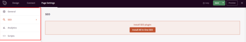 Gehen Sie zu Page Settings → SEO, um SeedProd mit dem All-In-One SEO Plugin zu integrieren. Mit dem Plugin richten Sie einen SEO-Titel und eine Meta-Beschreibung ein.