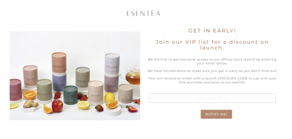Das folgende Bild ist ein Beispiel für eine „Coming Soon”-Page, die Leads generiert. Sie bietet einen Rabattcode zur Einführung an, um E-Mail-Anmeldungen mit einem CTA zu fördern und potenzielle Verkaufschancen zu schaffen, bevor das Unternehmen betriebsbereit ist.