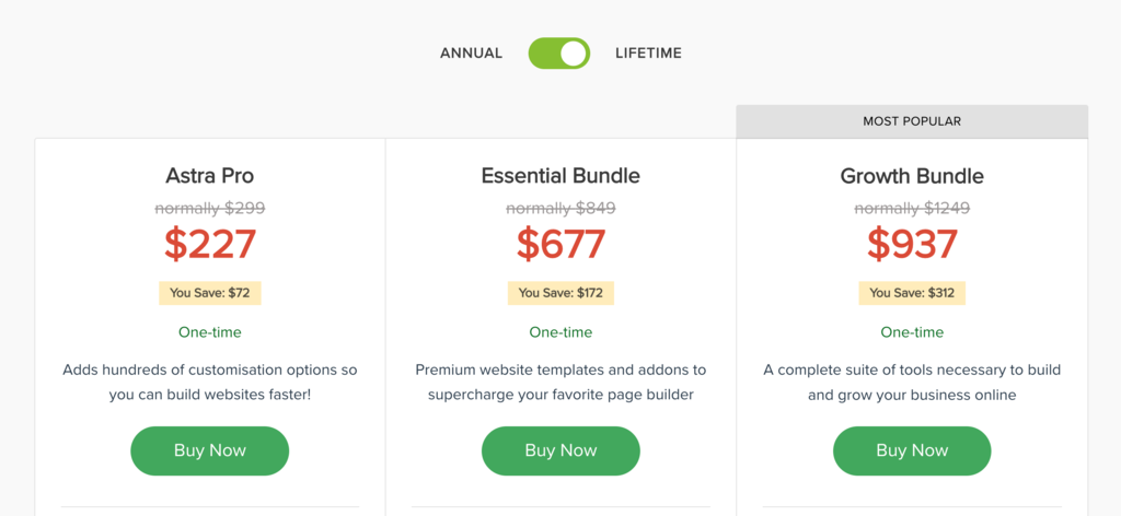 Werfen Sie zum Beispiel einen Blick auf die Preisgestaltung von Astra Pro. Es gibt drei Pläne – einen Basisplan für Astra Pro und zwei zusätzliche Pläne, die Add-ons für den Page Builder und Plugins enthalten. Diese Pläne werden sowohl als lebenslange Lizenz als auch als Jahresabonnement angeboten.