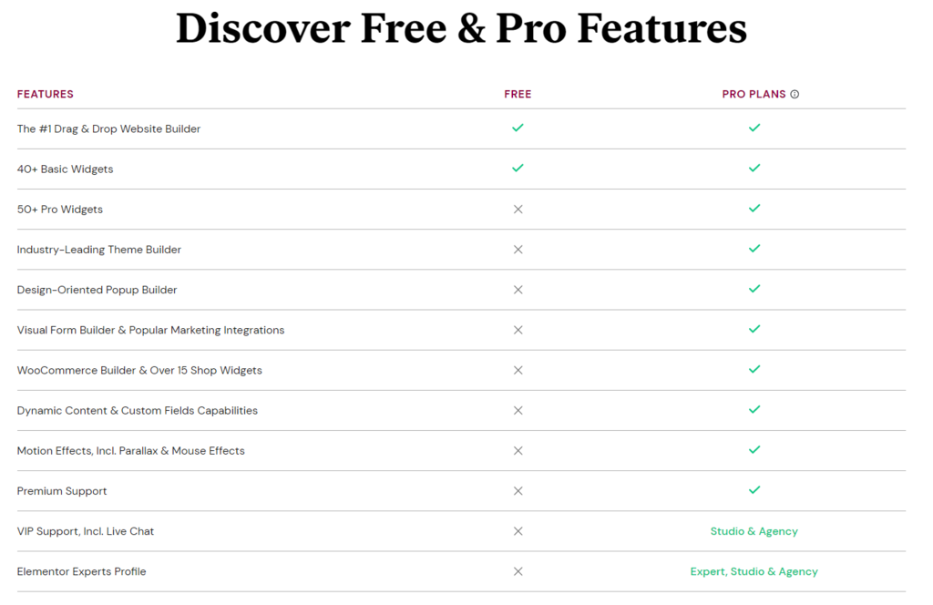 Elementor Pro hingegen bietet Funktionen wie einen Theme-Builder, Profi-Widgets, Profi-Vorlagen und Bewegungseffekte wie Parallax-Scrolling und Hover-Effekte. Der teuerste Plan umfasst auch VIP-Support per Live-Chat.