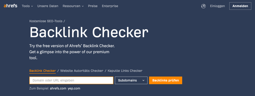 Tatsächlich haben die am höchsten platzierten Seiten bei Google durchschnittlich 3,8 Mal mehr Backlinks als die Seiten auf den Plätzen zwei bis zehn. Sie können Ihren Backlink-Status mit Ahrefs Backlink Checker, einem kostenlosen Optimierungstool, überprüfen.