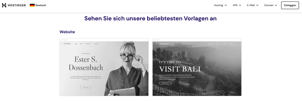 Wenn Sie sich nicht sicher sind, wo Sie mit der Optimierung Ihres Website-Designs beginnen sollen, können Sie sich jederzeit von anderen Websites inspirieren lassen oder eine professionell erstellte Design-Vorlage wählen. Bei Hostinger können Sie die beste Website-Vorlage für Ihre Bedürfnisse auswählen.