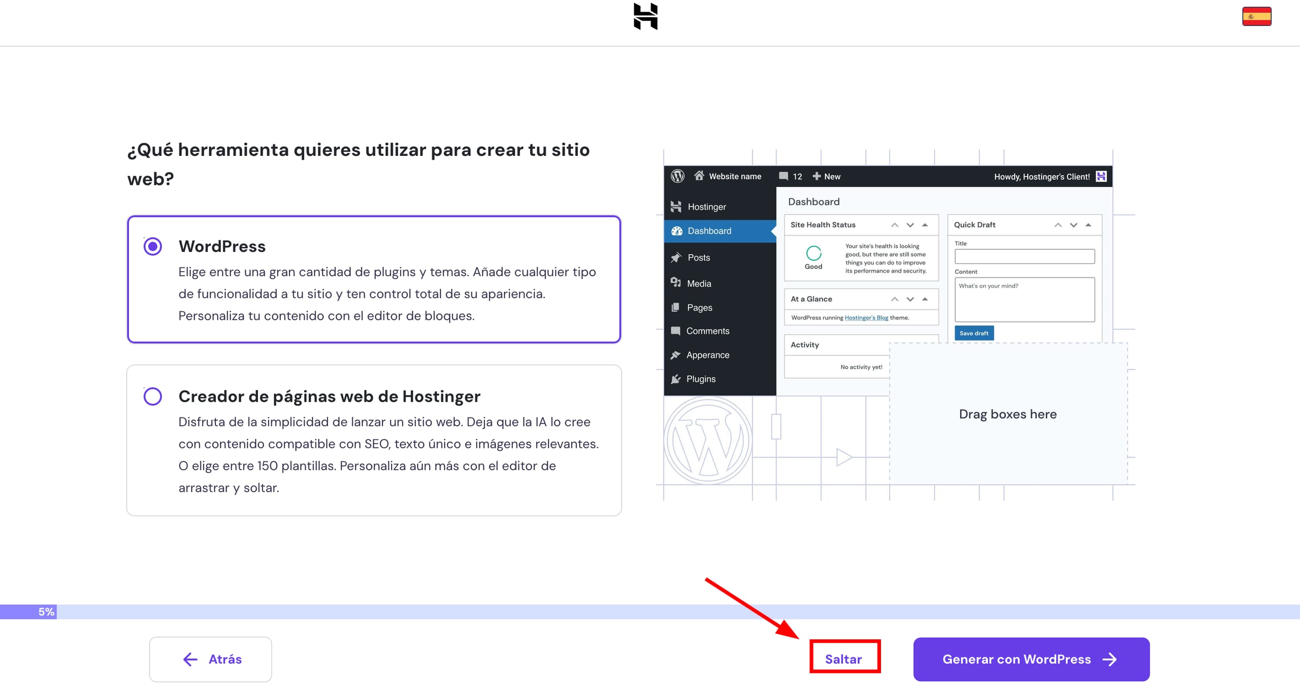 Algunos pasos del proceso de onboarding pueden saltarse si es necesario, por ejemplo, para crear un sitio web vacío, como se detalla en el siguiente apartado. 👇