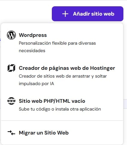 Para sitios web nuevos, selecciona una plataforma: WordPress o el Creador de Hostinger. Se te dirigirá al flujo correspondiente.