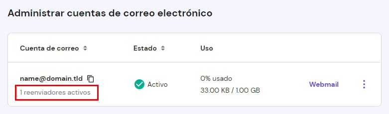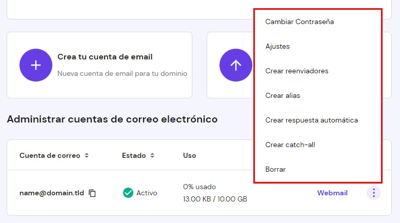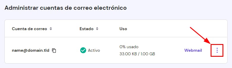 La sección Administrar cuentas de correo electrónico te proporcionará información sobre cuáles son tus cuentas de email creadas, el estado, el uso del disco, un acceso rápido a Webmail y el botón Opciones (⋮):