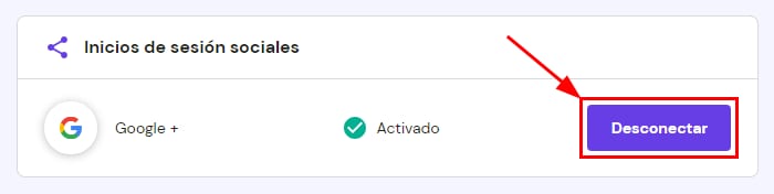 En la página Información de la cuenta, encontrarás la sección Inicios de sesión sociales, donde se mostrará tu método de inicio de sesión actual. Da clic en Desconectar: