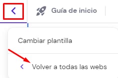 Para volver a tu panel después de trabajar en el Creador de sitios web, simplemente haz clic en el botón Atrás en la barra lateral del creador y luego en Volver a todas las webs: