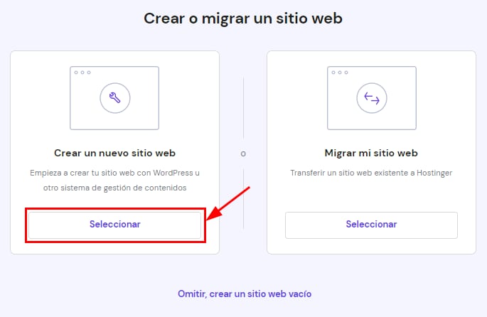 Todo lo que necesitas hacer es iniciar el proceso de configuración de un nuevo plan de hosting o agregar un sitio web. Después de la pantalla de bienvenida, selecciona qué tipo de sitio web deseas construir y elige Crear un nuevo sitio web:
