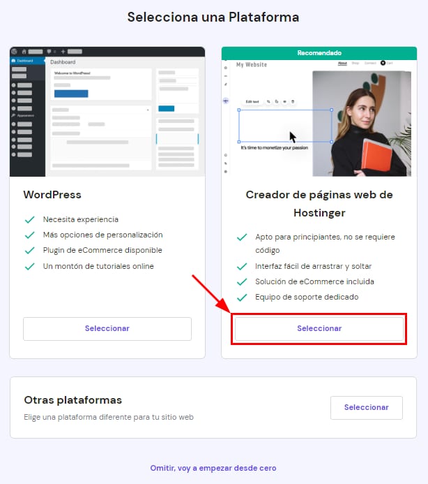 Si actualmente estás utilizando otro CMS para tu sitio web, como WordPress, y deseas probar el Creador de sitios web, deberás aplicar este cambio en tu panel de control y crear tu sitio web. Solo sigue esta guía: Cómo cambiar al Creador de sitios web de Hostinger.